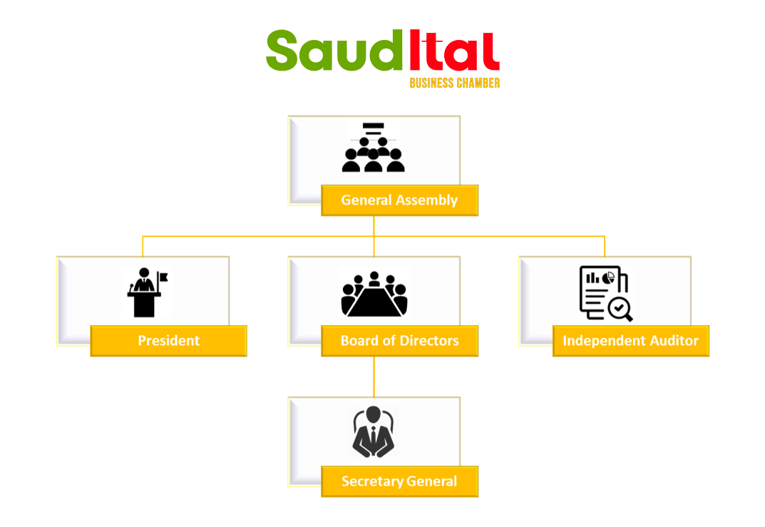 SaudItal Business Chamber follows a transparent and structured governance model, aligned with the principles of representativeness, legality, functional autonomy, and managerial accountability. Our organisational structure is designed to strike a harmonious balance between strategy, operations, and oversight, ensuring efficient processes, transparent decision-making, and solid management.